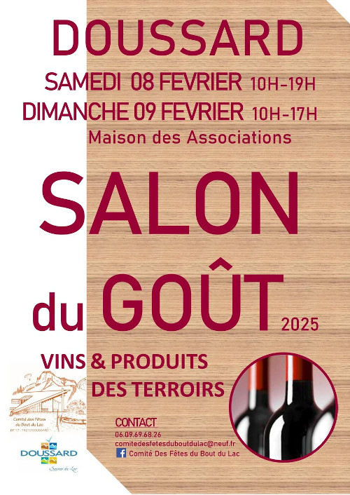 Salon du Goût, Vins et Produits du Terroir à Doussard by Marielle 11/02/2025 Posté par : Marielle 11/02/2025 413 Cet évènement a expiré. Related Events Salon Vinomedia à Lyon 27-02-2026 89 Avenue de Grenoble 38180 Seyssins , Isère, Auvergne-Rhône-Alpes Salon Salon Aux Vignobles ! Quimper 27-03-2026 32 Bis Rue de Stang Bihan 29000 Quimper, Finistère, Bretagne, France Salon #Payé Salon Aux Vignobles ! Caen 20-03-2026 Rue Joseph Philippon 14000 Caen, Calvados, Normandie , France Salon #Payé Salon Aux Vignobles ! Vannes 13-03-2026 Parc du Golfe 56000 Vannes, Morbihan, Bretagne, France Salon #Payé Salon Aux Vignobles ! Metz 27-03-2026 Rue de la Grange aux bois 57070 Metz, Moselle, Grand Est, France Salon #Payé 0 FacebookTwitterPinterestEmail Marielle previous post Bordeaux Rhum Festival next post La Foire aux Vins de Belfort